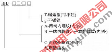 例:1.若需訂購防爆活接頭,材質(zhì)為碳素鋼、螺紋規(guī)格為G3/4〞,結(jié)構(gòu)型式為兩端內(nèi)螺紋,則訂貨型號為“BHJ-G3/4A”;2.若需訂購防爆活接頭,材質(zhì)為不銹鋼、螺紋型式為一端內(nèi)一端外螺紋,內(nèi)螺紋規(guī)格為G3/4〞,外螺紋規(guī)格為M25×1.5,,則訂貨型號為“BHJⅡ-B(G3/4內(nèi)M25×1.5外”。