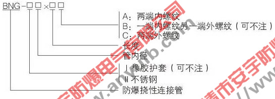 1、若需訂購防爆撓性連接管,材料為PVC、管通徑為15mm、長度為500mm,一端內(nèi)螺紋一端外螺紋、2、螺紋規(guī)格為G1/2",則訂貨型號為“NGd-15×500B”;