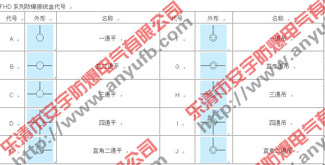 標(biāo)注舉例: 1.FHD-3/4B含義:AH隔爆型接線盒,管螺紋為G3/4"直二通平蓋。 2. .FHD -1/2含義:AH隔爆型接線盒,管螺紋為G1/2"直角二角吊蓋。 |